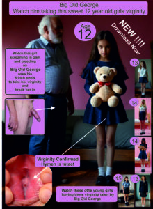 Then in the video a picture appeared, adverising what other young girls “First Time Videos” that were available to down load for a price. You could see the old man, who was knowen as “Big Old George” who had raped those girls it even had a close up showing how large his revolting penis was. In the center it showed a new girl, whos first time video was now availbul to download. It even showed that the poor young girl had definitly been a virgin before the old man had raped her.